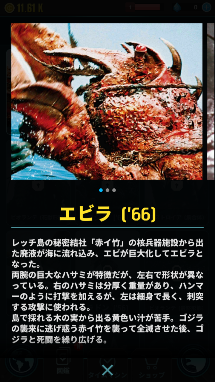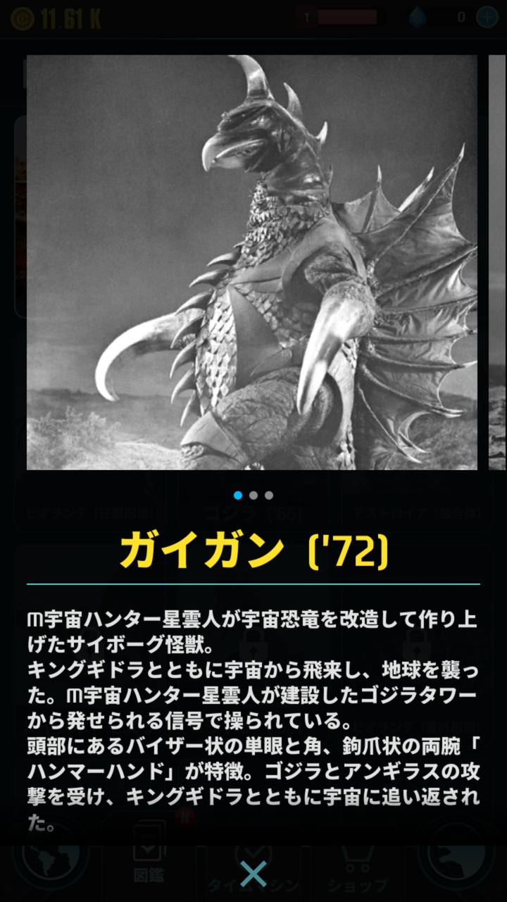 怪獣を撃退する、もしくは購入することで(前述の通り無料パックもあり)入手できるのですが、作品内の写真とともに載っている解説がまたイイんですよ。