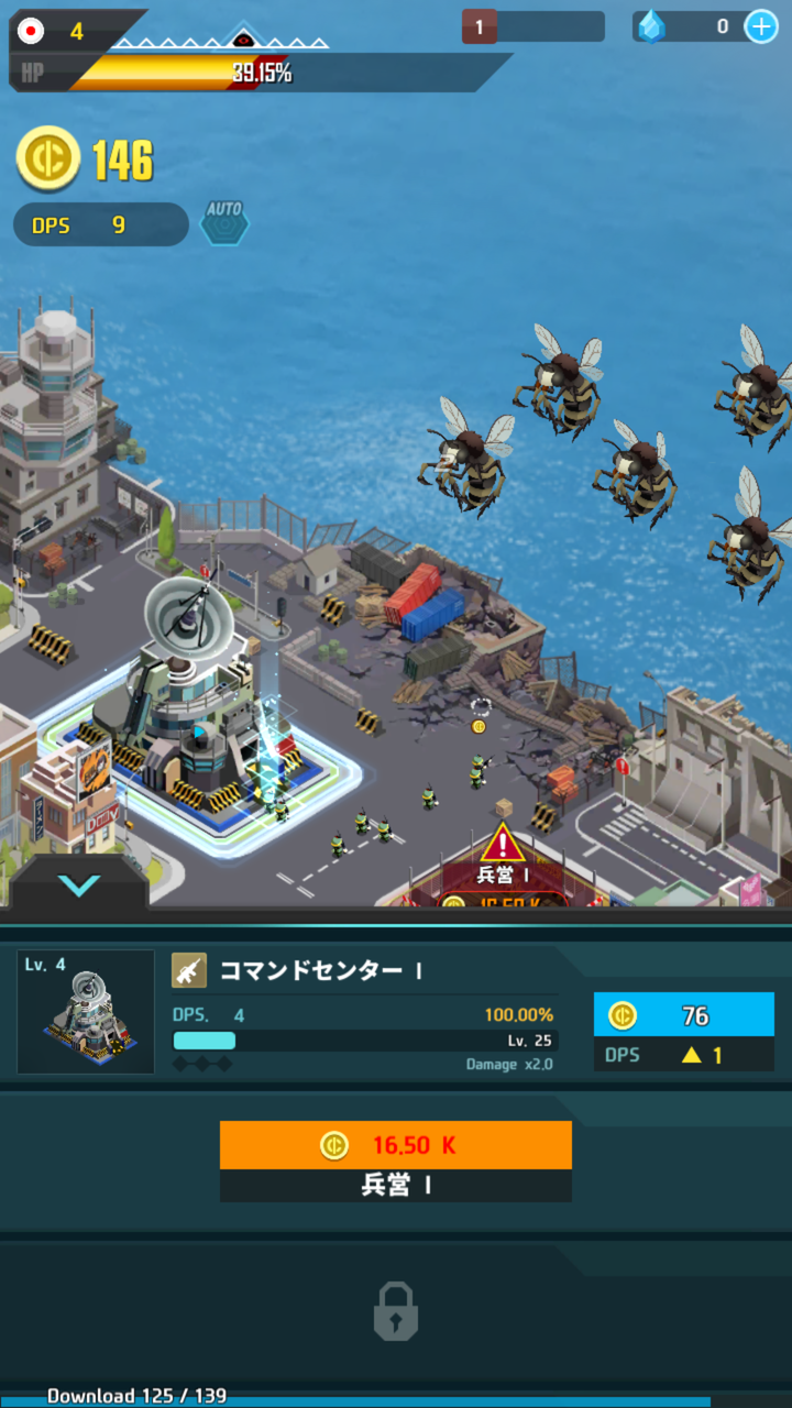 基本は画面をタップ!タップ!連続タップ!で、兵隊がわらわら現れて巨大バチどもを攻撃します。