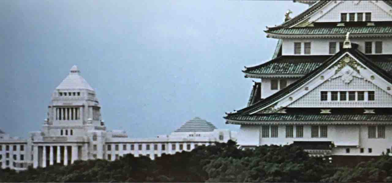 ゴジラの襲撃で大きな被害を受けた東京から、首都が大阪に遷都されており、大阪城のバックに国会議事堂があるという奇天烈極まりない日本の姿。