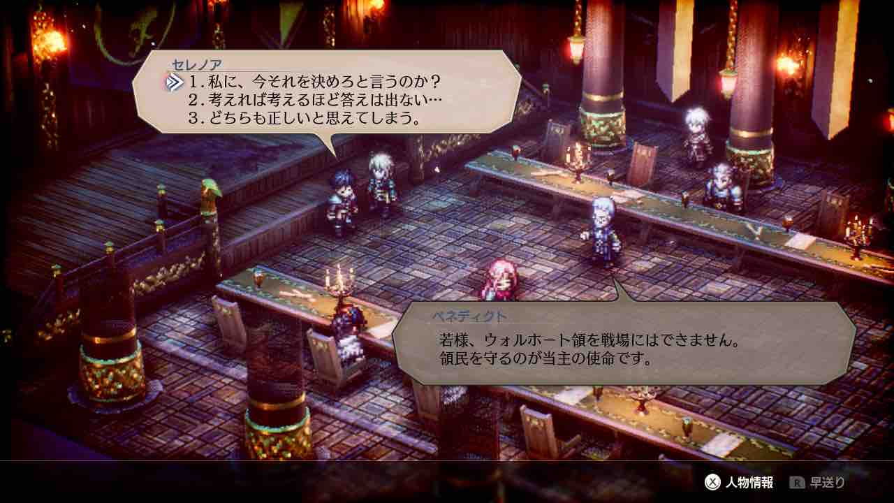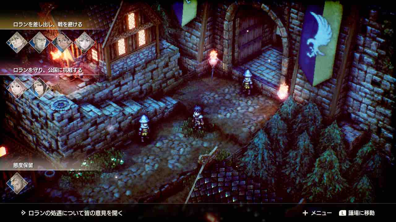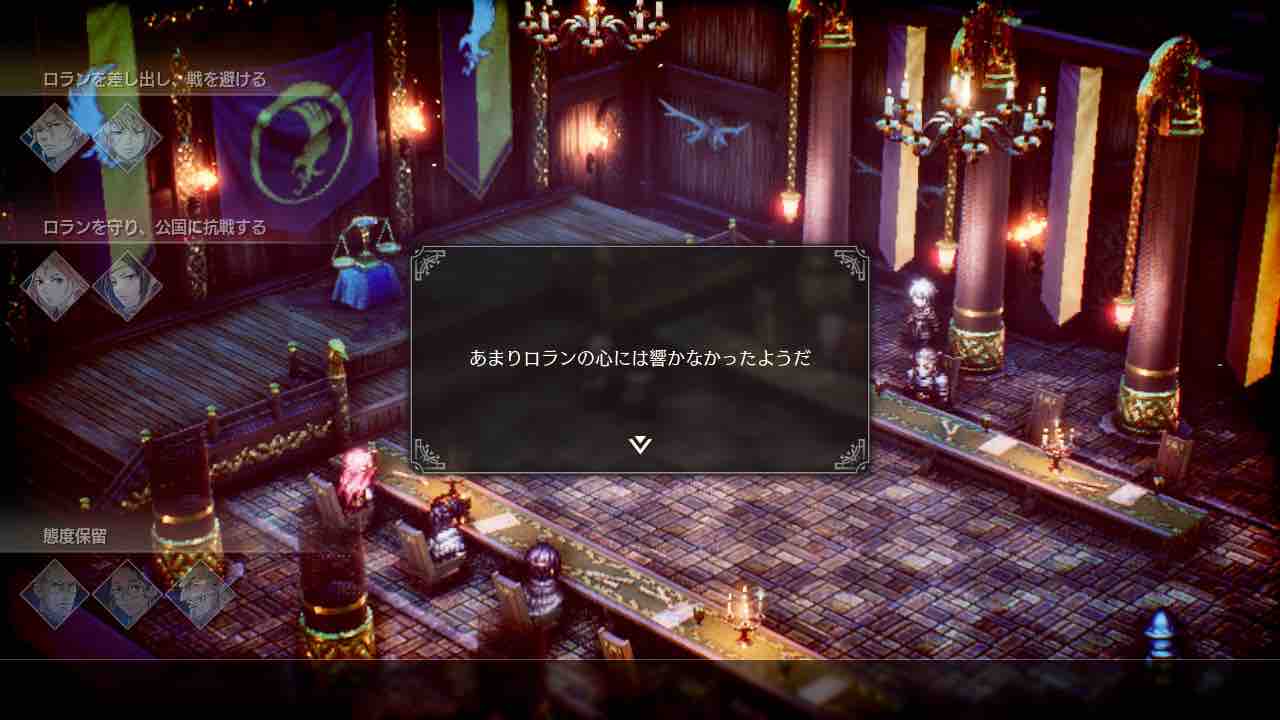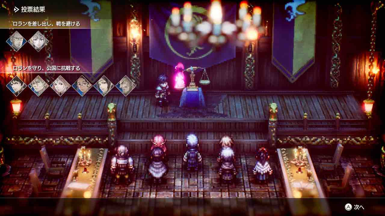 しかし、今作「トライアングルストラテジー」では、その選択肢を主人公1人で決定するのではなく、仲間全てによる投票によって決めるようになってます。