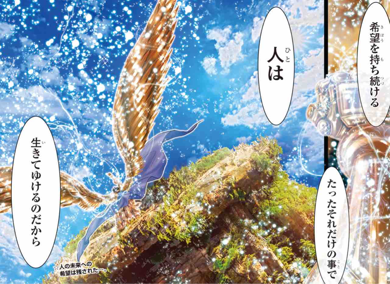 アテナがその役目を担っていた地上に降り注ぐ業火を引き受けるのを、ハーデスの呪いによって不滅の肉体となった星矢が黄金聖闘士たちの想いと共に引き継ぎ、地上に残った人々を守るための人柱となった。