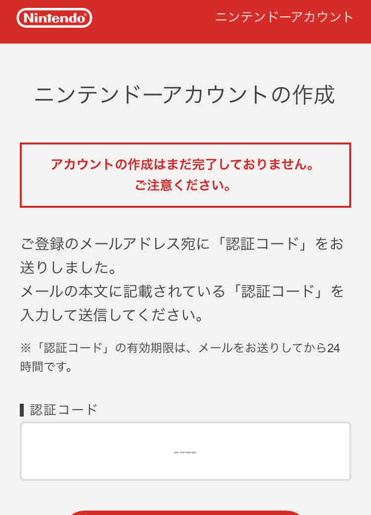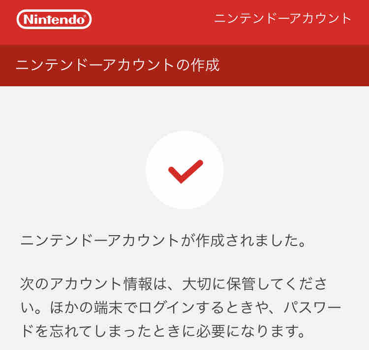 送信したら、ニンテンドーアカウントが作成されましたという画面に切り替わるはずです。