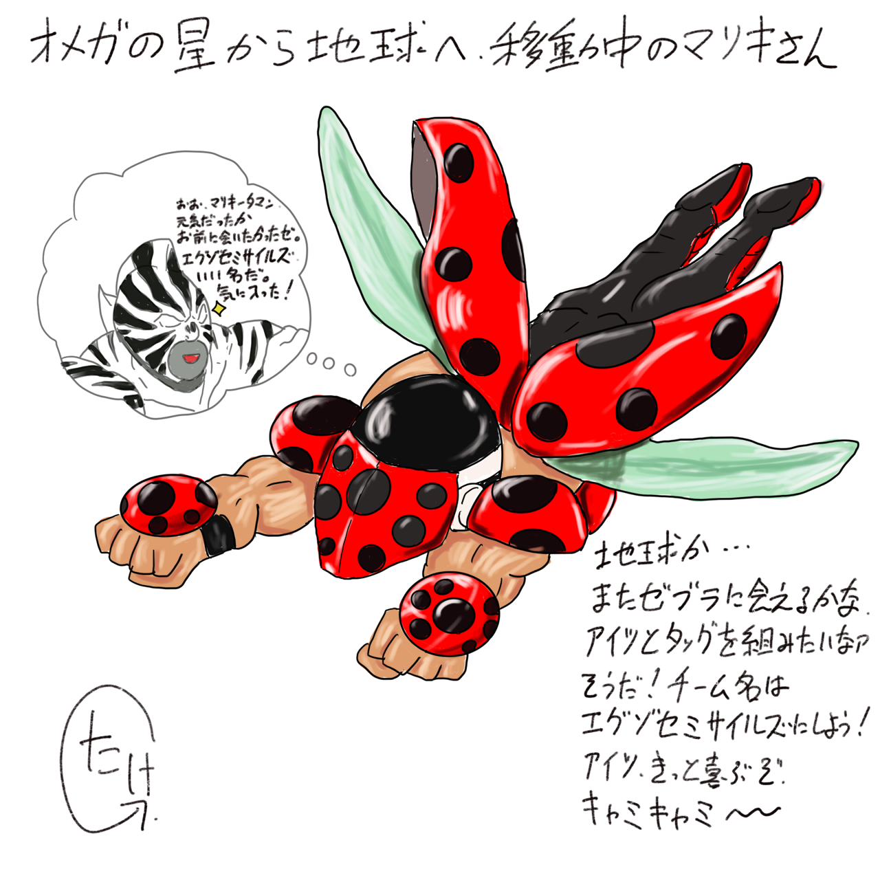 対してマリキータマンは羽を広げて飛べるテントウムシモチーフな超人。