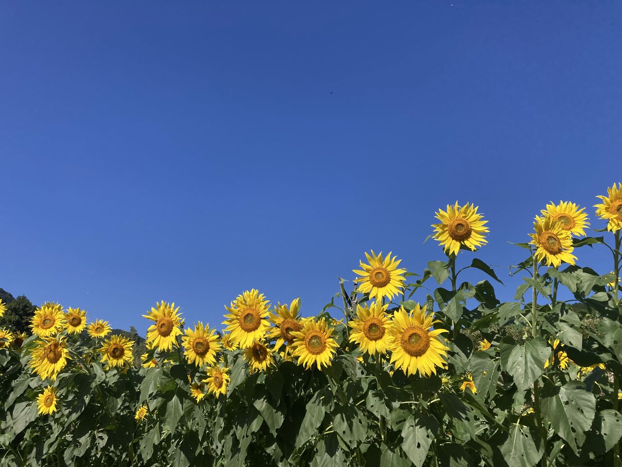 本当に真っ青な、秋の青空にひまわりの花々がよく映える。