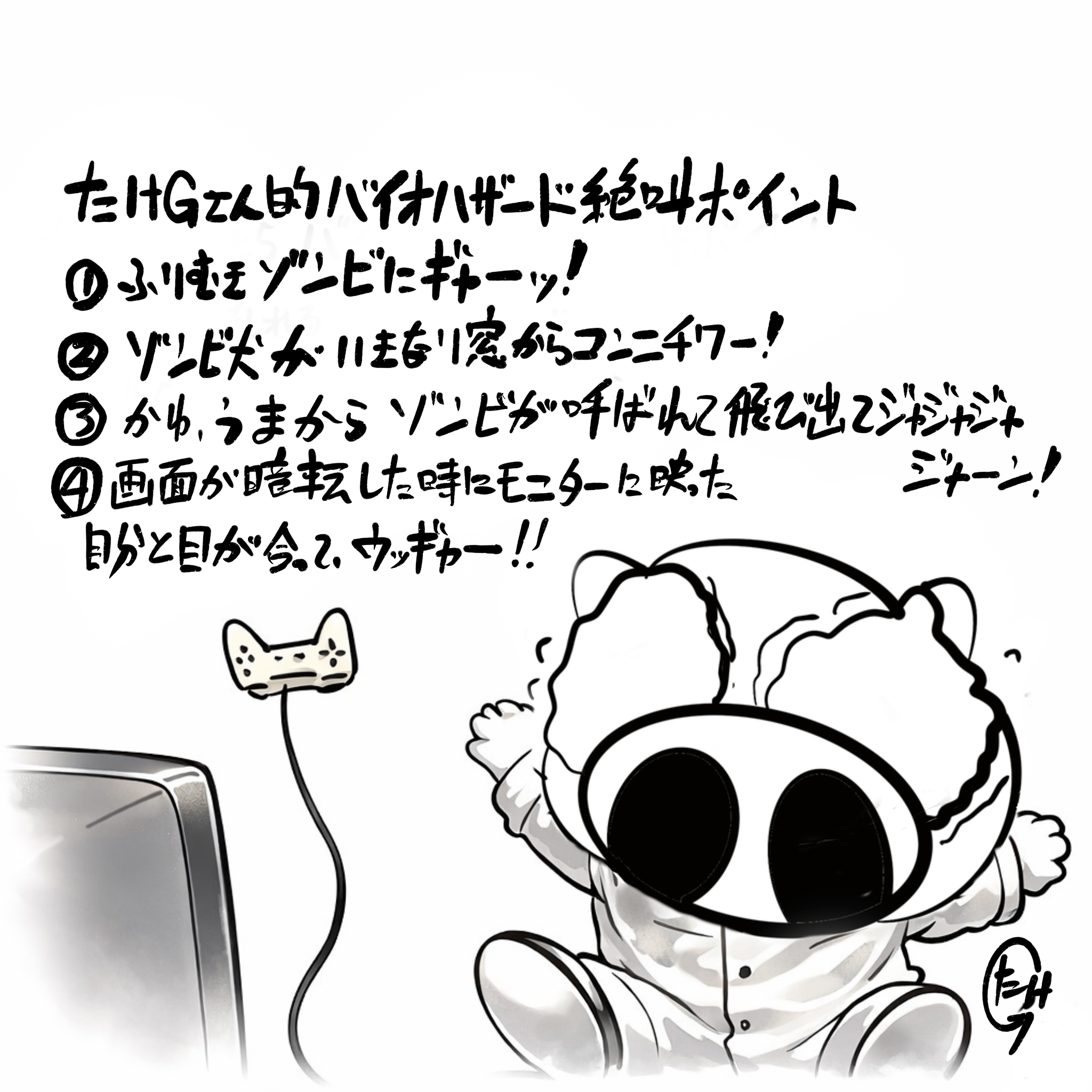多分、タイラントやハンターといったいわゆる生物兵器達はこちらに対して明確な殺意をもって襲ってくるのでこちらも知恵と勇気でもって立ち向かう事が出来るのでしょうけど、ゾンビは違うんですよ。