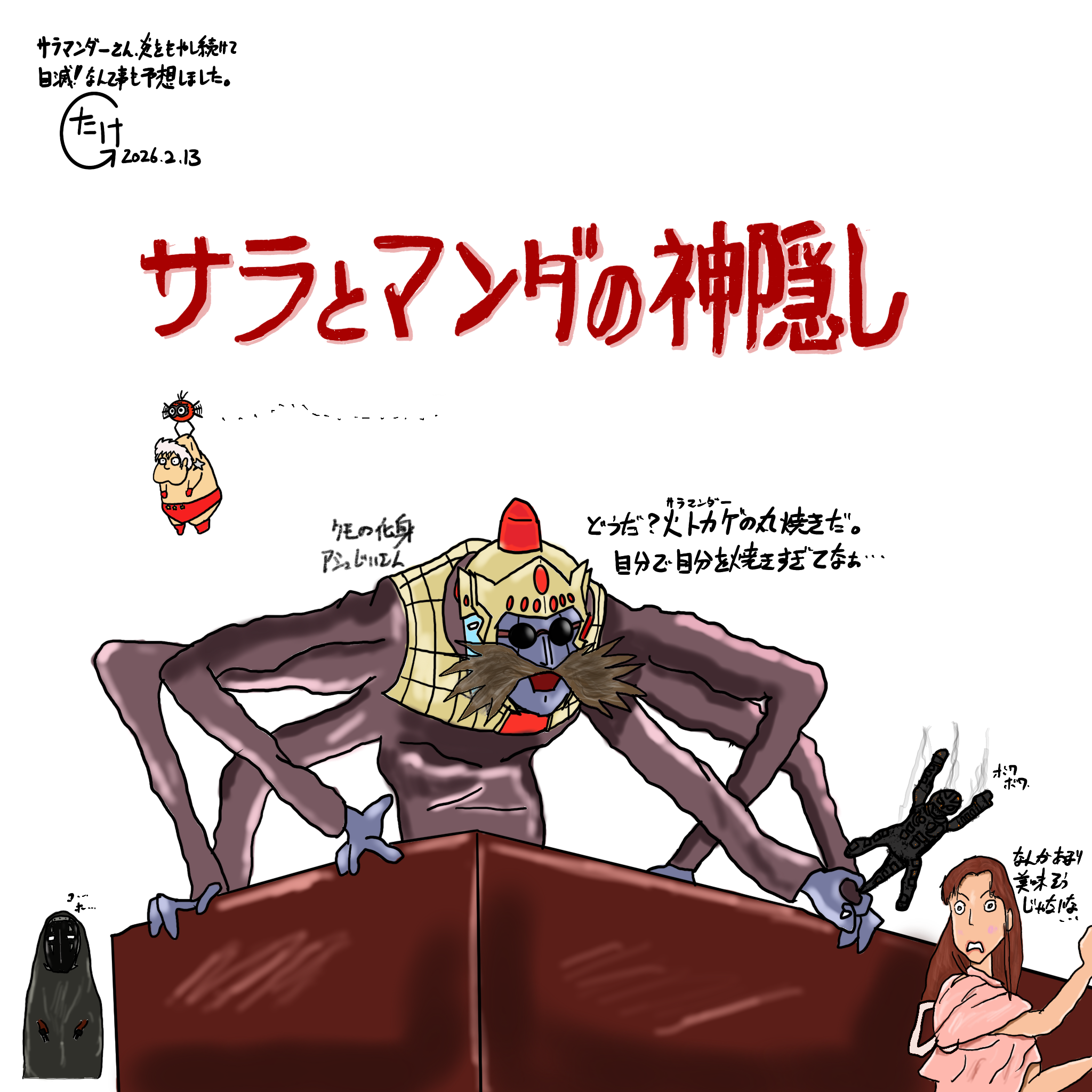 そのアシュラマンに対して添い寝するように寝そべり、愉快そうに眺めるサラマンダー。